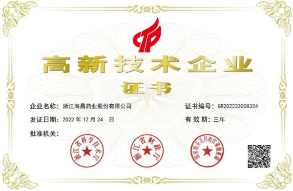 海昌藥業(yè)是國家高新技術(shù)企業(yè),擁有一支年輕化、專(zhuān)業(yè)化的科研隊伍和先進(jìn)的生產(chǎn)檢測設備、完善的基礎設施;開(kāi)發(fā)的新產(chǎn)品、新技術(shù)獲得國家藥監局注冊批文,通過(guò)了GMP、PIC/S認證,積極推進(jìn)CEP認證工作。同時(shí),公司還榮獲省科技型中小企業(yè)、省級創(chuàng )新型中小企業(yè)、省級專(zhuān)精特新中小企業(yè)、省級商業(yè)秘密保護示范基地、省級研發(fā)中心、臺州市技術(shù)中心等榮譽(yù),通過(guò)了安全三級標準化、知識產(chǎn)權貫標體系、ISO三體系(ISO9001、ISO14001、ISO45001)的認證。